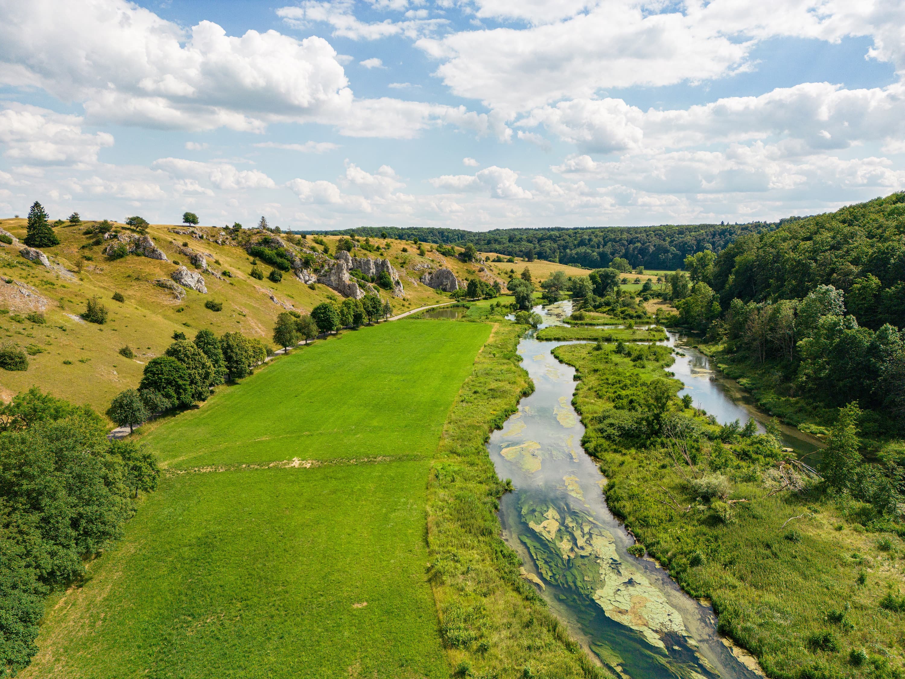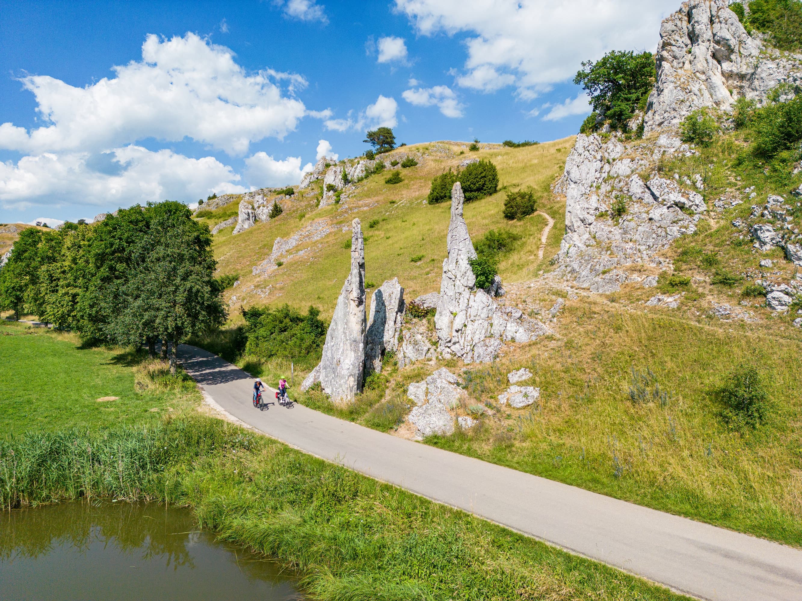 From above, we see the two cyclists from the beginning again. The cycle path leads along a wide stream through lush green meadows. You can hear the rustling of the leaves and the gentle flow of the water.